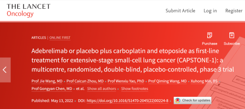 北京时间2022年5月14日,利来医药自主研发的PD-L1抑制剂阿得贝利单抗治疗广泛期小细胞肺癌的III期临床研究(CAPSTONE-1研究)成果正式全文在线发表于国际权威学术期刊《柳叶刀·肿瘤学》(《THE LANCET Oncology》,影响因子41.316)。CAPSTONE-1研究结果显示,阿得贝利单抗联合化疗一线治疗广泛期小细胞肺癌相较于安慰剂联合化疗可以显著延长患者总生存期至15.3个月[1],刷新现有免疫药物一线治疗广泛期小细胞肺癌的总生存纪录[2]。